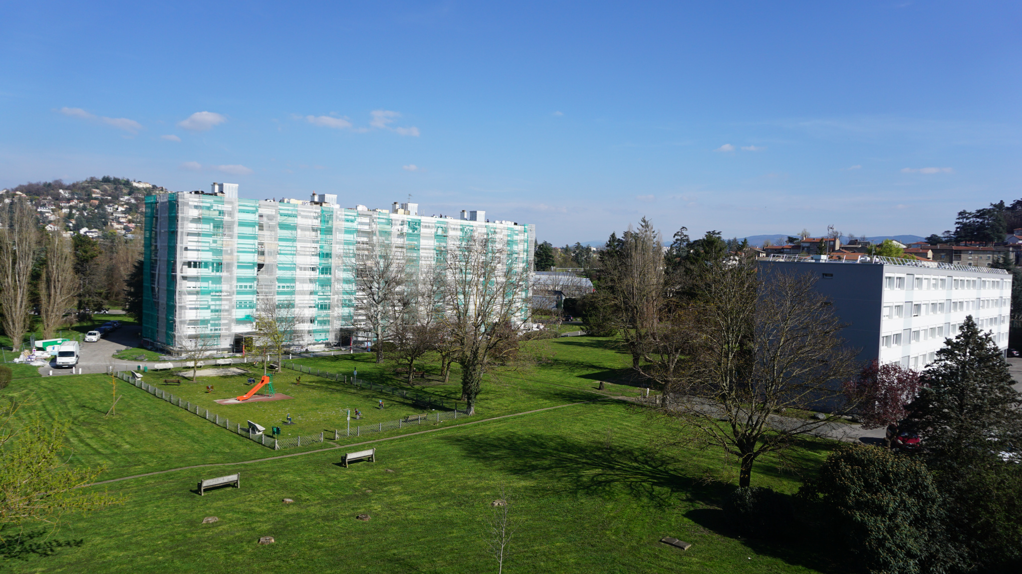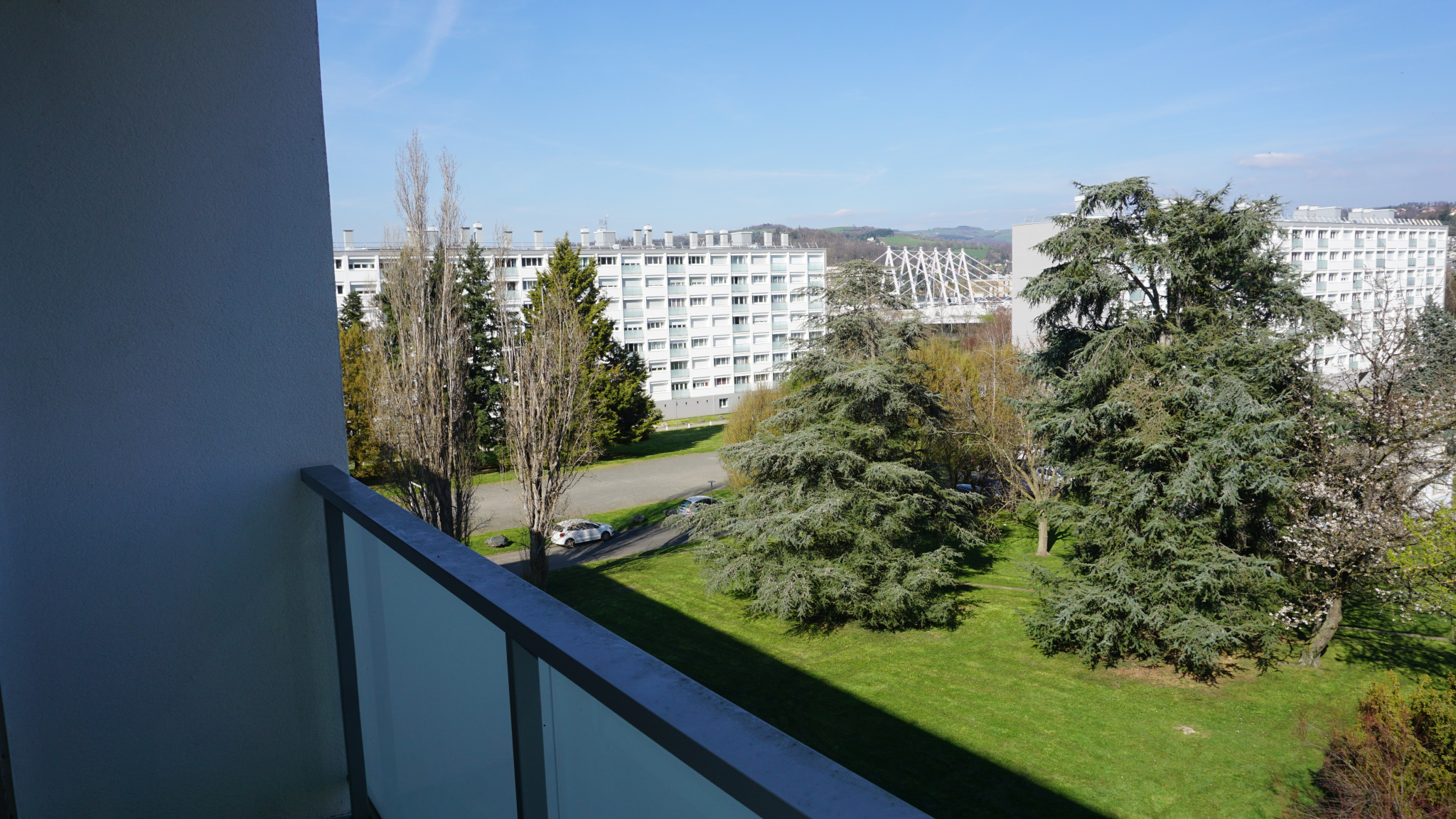 Personne au-dessus de la tête, un balcon sur le séjour qui ouvre sur un vaste parc de verdure où les enfants peuvent jouer en toute sécurité, un parc doté de bancs, un parc comme il en existe plus beaucoup !!!